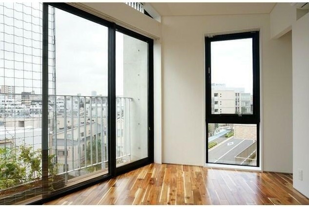 【 マンション 】温かみのある無垢材を使用、天井高が高く開放感ある窓が特徴的なデザイナーズマンション。インターネット利用料無料、バイク置場も敷地内にあります