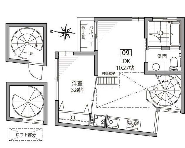 | 最上階、角部屋、二面採光の風通しに優れたロフト付きの1LDK。インターネット利用料無料の室内は追い炊きや独立洗面台、3口システムキッチン等の設備が整い、螺旋階段がお洒落なデザイナーズ賃貸です。 |
