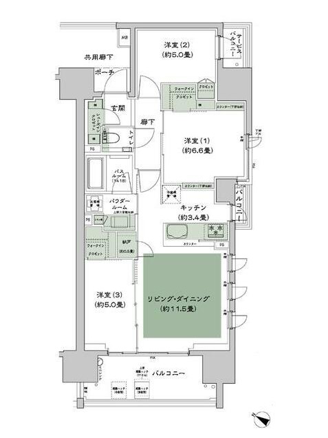 南西向き、角部屋、二面バルコニーの3LDKはウォークインクローゼット2か所、シューズインクローゼットと収納が豊富。食洗器付きのカウンターキッチンや床暖房、追い炊き、三面鏡付独立洗面台等の設備が充実