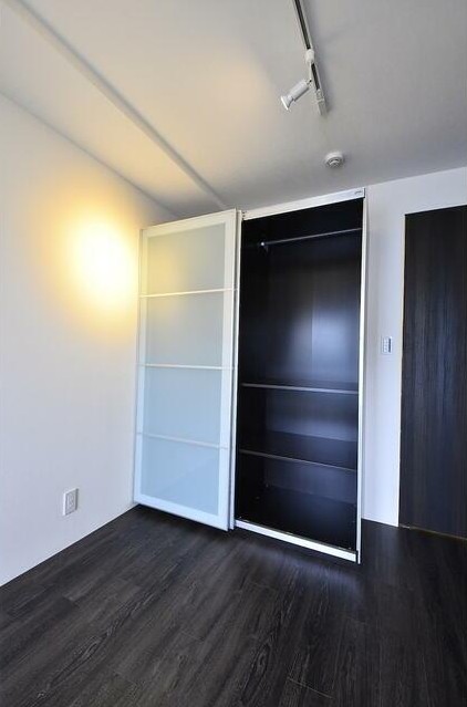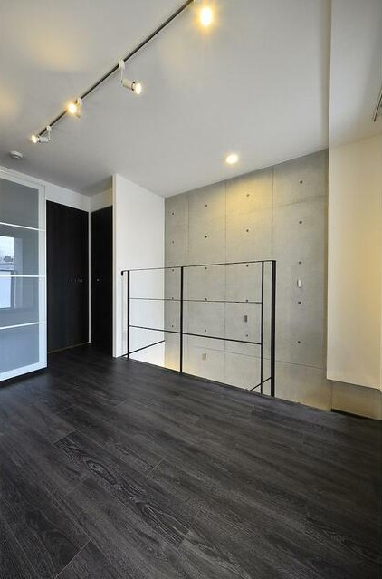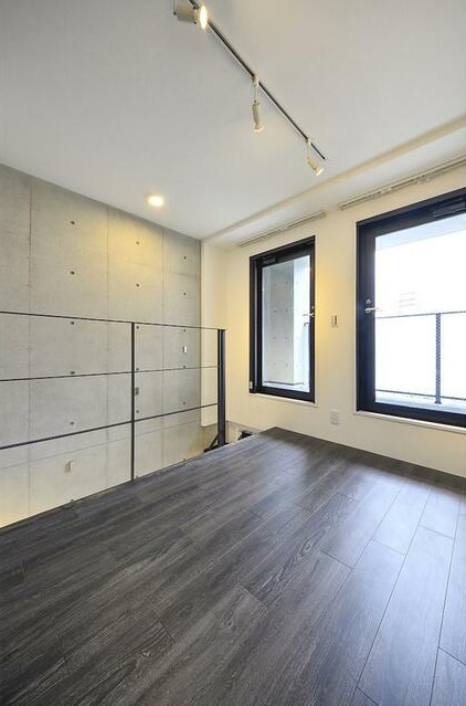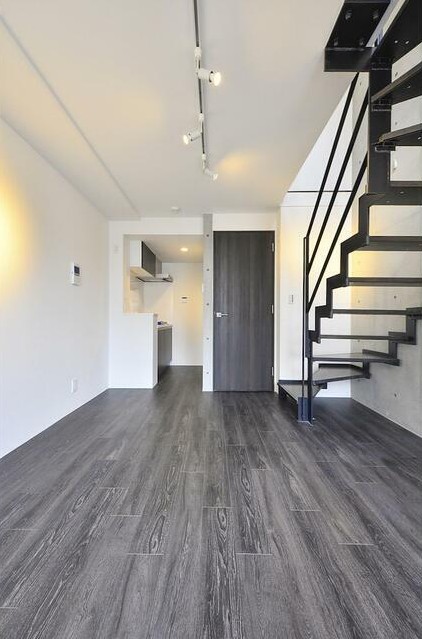 コンクリート打ちっぱなしの室内をスポットライト照明が照らすデザイナーズマンション。ペットの飼育が可能な最上階、メゾネットの室内は独立洗面台や浴室乾燥機、追い炊き、システムキッチン等の設備が充実