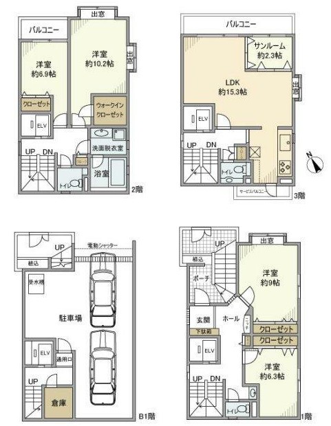 | 間取り詳細 | LDK:15.3畳 洋室:10.2畳、9畳、6.9畳、6.3畳 サンルーム:2.3畳 |