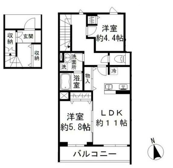 | 間取り詳細 | LDK:11畳 洋室:5.8畳、4.4畳 |