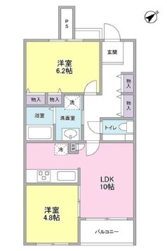 | 間取り詳細 | LDK:10畳 洋室:6.2畳、4.8畳 |