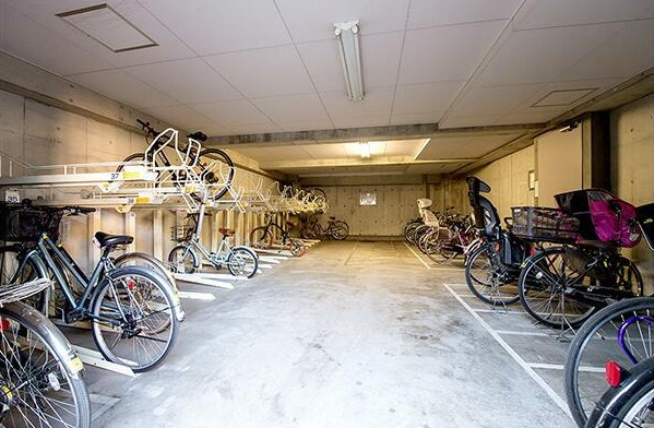 南西向きの2LDKはグリル付きの3口システムキッチンや追い炊き、浴室乾燥機、三面鏡付洗髪洗面化粧台、温水洗浄便座、エアコン3基と設備が充実。無料の駐輪場や自走式駐車場、宅配ボックス等の共用設備も豊富