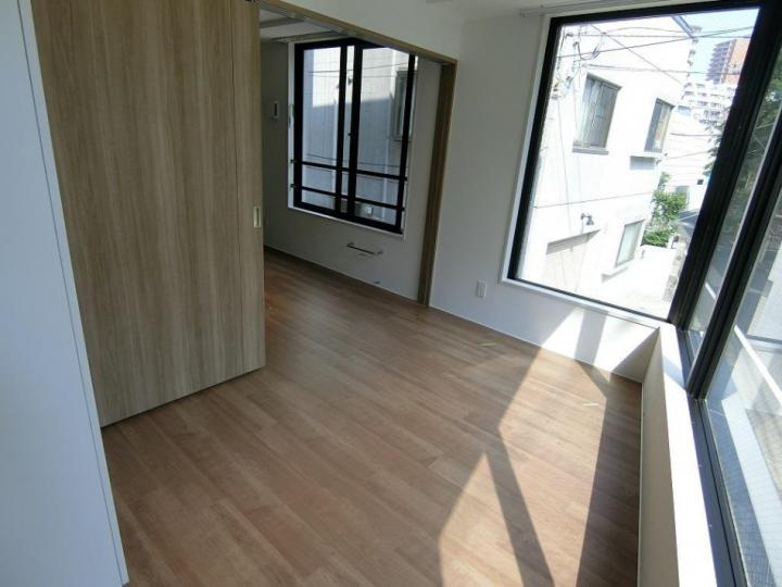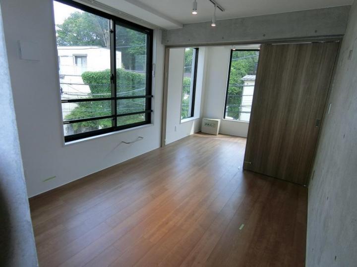 南東向き、角部屋、二面採光の2DKはスポットライト照明や一部コンクリート打ち放しがお洒落なデザイナーズ。グリル付3口システムキッチンや追い炊き、浴室乾燥機、独立洗面台、温水洗浄便座等の設備も充実。