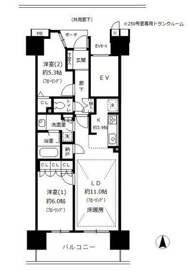 南向きの2LDKは室内でアップライトピアノの演奏が可能。リビングの床暖房やディスポーザー、グリル付きの3口システムキッチン、追い炊きや浴室乾燥機、三面鏡付洗髪洗面化粧台、トランクルーム等の設備が充実