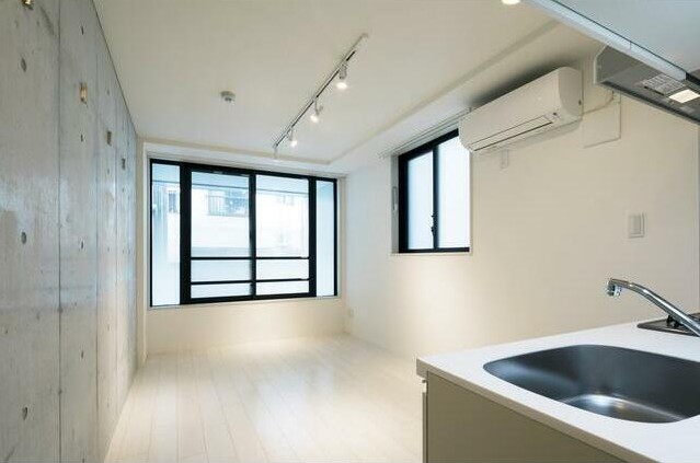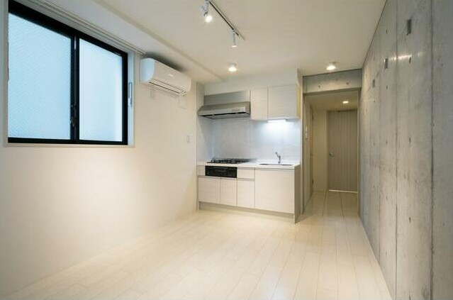 南向き、角部屋、二面採光の風通しに優れた1LDK。コンクリート打ち放しの壁をスポットライト照明が照らすお洒落な室内はシステムキッチンや浴室乾燥機、独立洗面台、シャワートイレ等の設備が充実してます
