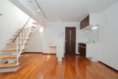 二面採光の風通しに優れたメゾネットの1LDK。吹き抜けがあり開放的なオール電化の室内はIHシステムキッチンや独立洗面台、浴室乾燥機、温水洗浄便座等の設備に優れ、モニター付オートロックがあり女性も安心。