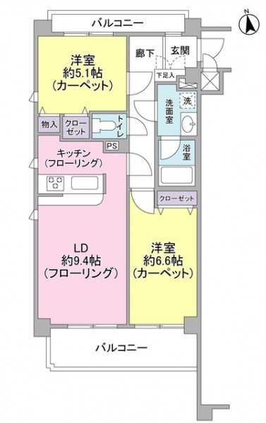 | 間取り詳細 | LD:9.4畳 洋室:6.6畳、5.1畳 |