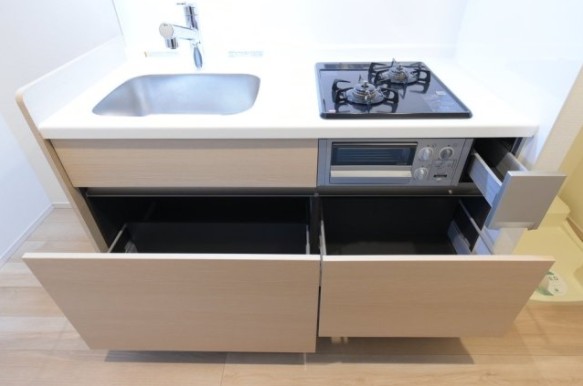 南西向きの室内はグリル付きの2口システムキッチンや追い炊き、浴室乾燥機付きのお風呂、三面鏡付独立洗面化粧台、温水洗浄便座、エアコン等の設備に優れ、ウォークインクローゼットがあり収納も豊富です。