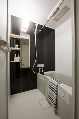 南向きの室内は一部コンクリート打ち放しの壁をスポットライト照明が照らすお洒落な室内。独立洗面台や浴室乾燥機、2口システムキッチン、温水洗浄便座等の室内設備や宅配ボックス、防犯カメラ等の共用設備も充実。