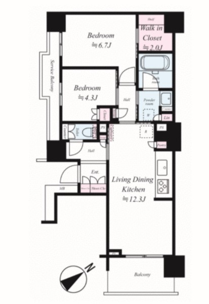 | 間取り詳細 | LDK:12.3畳 洋室:6.7畳、4.3畳 |