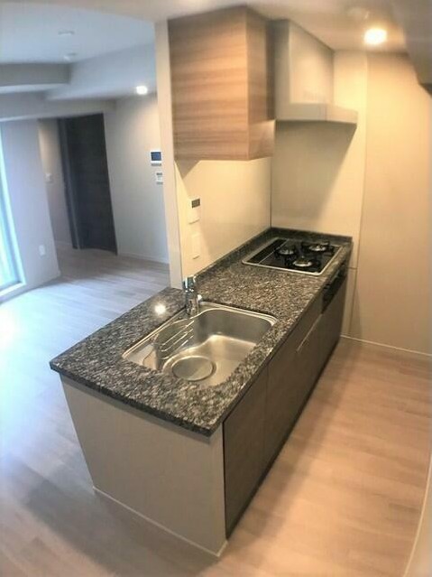 インターネットが無料で利用可能な最上階の1LDKは床暖房や食洗器、浄水器、グリル付きの3口カウンターキッチン、追い炊き、浴室乾燥機、三面鏡付独立洗面化粧台、ALSOKセキュリティ加入等の設備が充実。