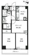 グリル付きの3口システムキッチンや独立洗面台、温水洗浄便座等の設備に優れた2LDK。モニター付オートロックやダブルロックキー等の防犯設備やゴミ置場、エレベーター、バイク置場等の共用部も充実の分譲賃貸