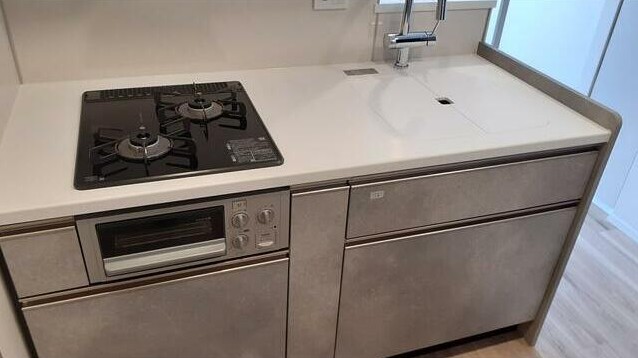 最上階、南向きの1LDKはウォークインクローゼットがあり収納豊富。ミストサウナや追い炊き、浴室乾燥機付きのお風呂やグリル付きのカウンターキッチン、床暖房、三面鏡付洗髪洗面化粧台等の設備に優れた新築マンション