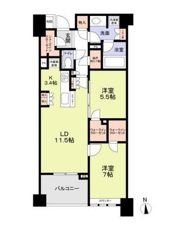 南向きの2LDKはウォークインクローゼットが2か所、シューズインクローゼットもあり収納が豊富。グリル付3口カウンターキッチンや追い炊き、浴室乾燥機、三面鏡付洗髪洗面化粧台、タンクレストイレ等の充実設備