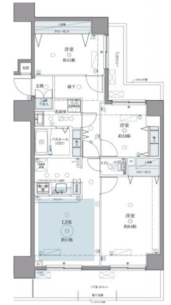 | 間取り詳細 | LDK:11畳 洋室:8.4畳、4.5畳、3.8畳 |