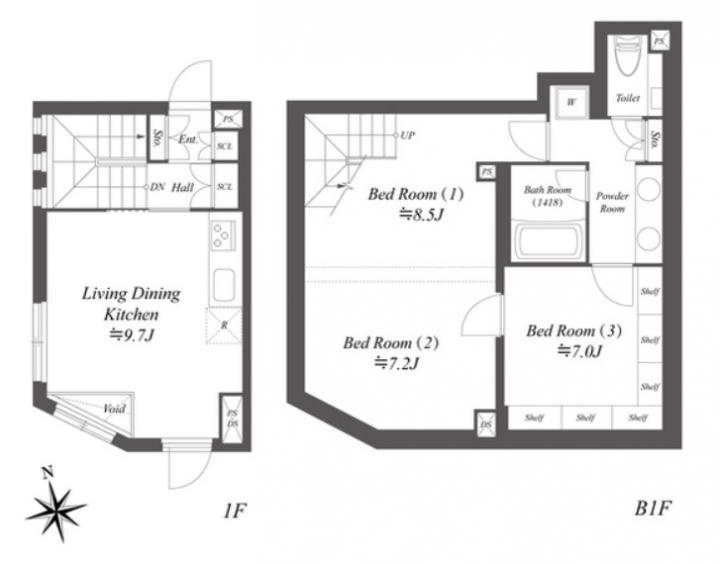 【仲介手数料不要、フリーレント1ヶ月】インターネットが無料で楽しめるメゾネットタイプのデザイナーズマンション。グリル付きの3口システムキッチンや追い炊き、浴室乾燥機、三面鏡付独立洗面台等の設備が充実