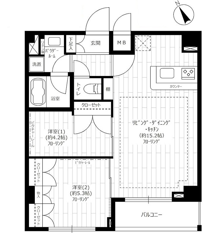 | 間取り詳細 | LDK:15.2畳 洋室:5.3畳、4.2畳 |
