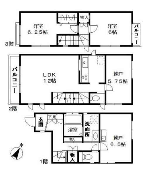 | 間取り詳細 | LDK:12畳 洋室:6.25畳、6畳 S:6.5畳、5.75畳 |