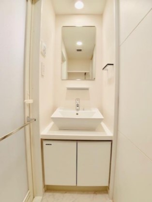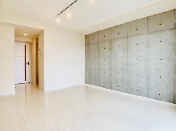 最上階、角部屋、南東向き、一部コンクリート打ち放しの壁をスポットライト照明が照らすお洒落な室内。システムキッチンや独立洗面台、浴室乾燥機、温水洗浄便座等の水回りの設備も充実したデザイナーズマンション