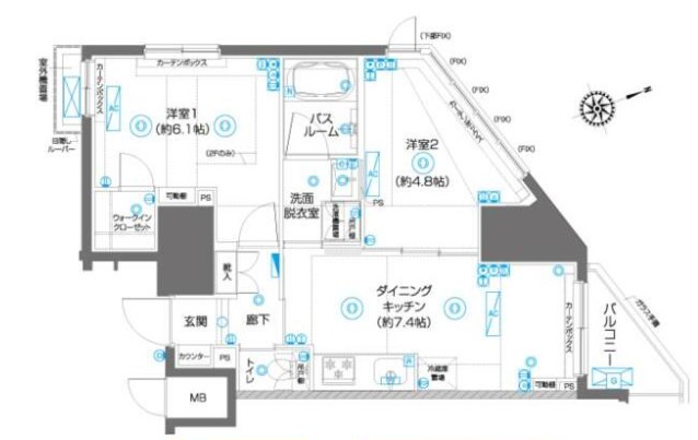 | 間取り詳細 | DK:7.4畳 洋室:6.1畳、4.8畳 |