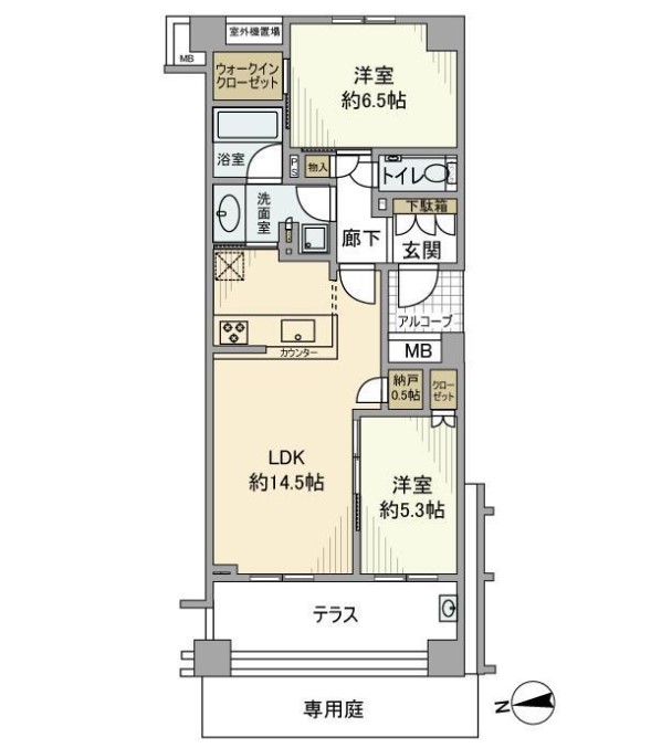 | 間取り詳細 | LDK:14.5畳 洋室:6.5畳、5.3畳 |