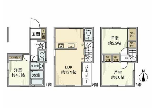| 間取り詳細 | LDK:12.9畳 洋室:6畳、5.5畳、4.7畳 |