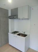 コンクリート打ち放しの壁をスポットライト照明がお洒落に照らすデザイナーズマンション。2口ガスのシステムキッチンや独立洗面台、浴室乾燥機、エアコン等の室内設備や宅配ボックス、駐輪場等の共用設備も充実