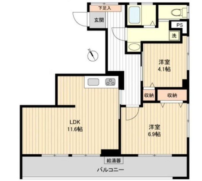 | 間取り詳細 | LDK:11.6畳 洋室:6.9畳、4.1畳 |