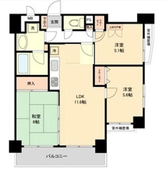 | 間取り詳細 | LDK:11.6畳 洋室:5.6畳、5.1畳 和室:6畳 |