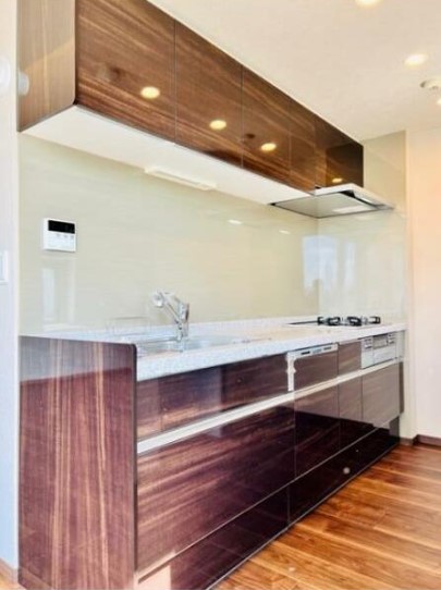 リビングからの開放感ある眺めが特徴的な二面採光の角部屋。3口ガスのシステムキッチンや追い炊き、浴室乾燥機、三面鏡付独立洗面台、温水洗浄便座等の設備に優れ、宅配ボックスやゴミ置場等の共用設備も充実。