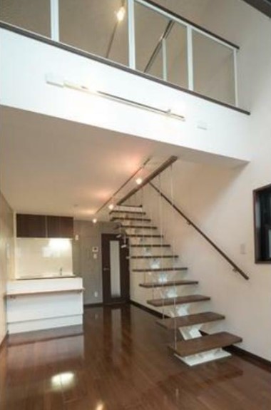二面採光の風通しに優れたメゾネットの1LDK。吹き抜けがあり開放的なオール電化の室内はIHシステムキッチンや独立洗面台、浴室乾燥機、温水洗浄便座等の設備に優れ、モニター付オートロックがあり女性も安心。