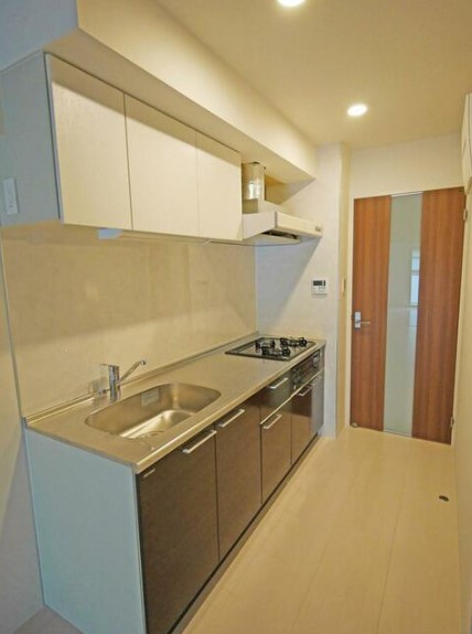 南東向きの1LDKはグリル付き3口システムキッチンや追い炊き、浴室乾燥機付きのお風呂、シャンプードレッサー、温水洗浄便座等の設備が整い、宅配ボックスやエレベーター、駐車場、バイク置場等の共用部も充実。
