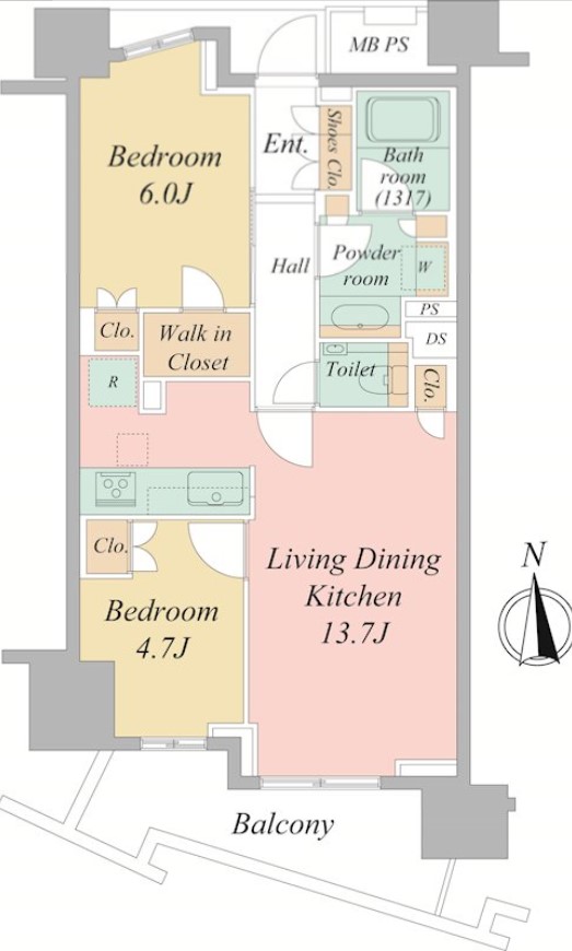 | 間取り詳細 | LDK:13.7畳 洋室:6畳、4.7畳 |