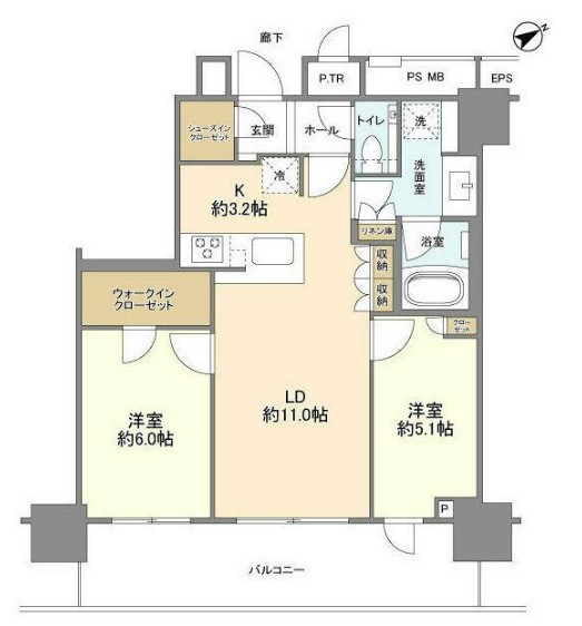 | 間取り詳細 | LDK:14.2畳 洋室:6畳、5.1畳 |