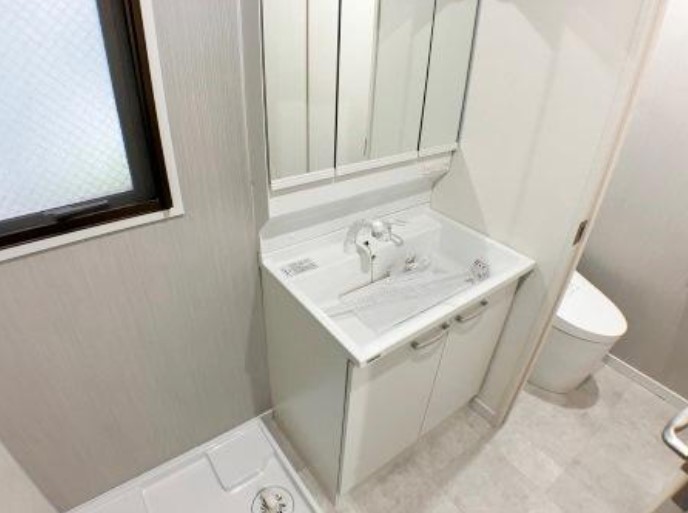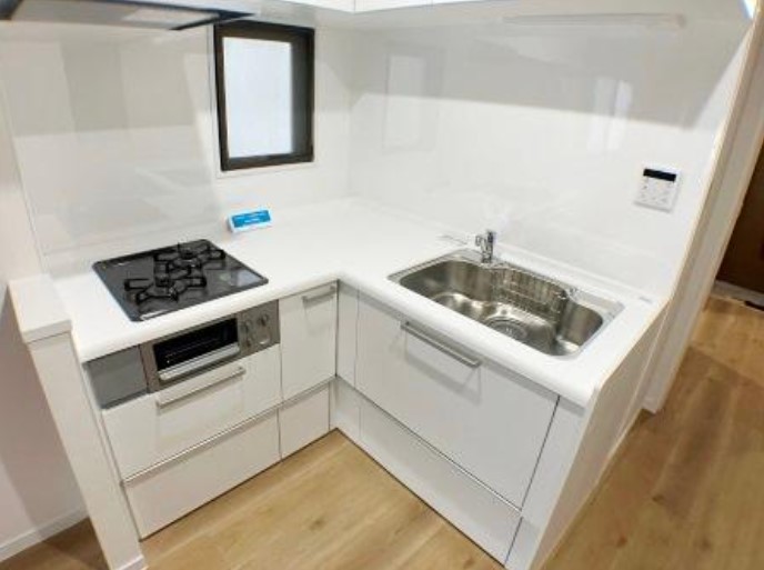 南西向き、角部屋、複数面採光の3LDK。リノベーション済みの室内はグリル付きのL字型システムキッチンや追い炊き、三面鏡付き洗髪洗面化粧台、温水洗浄便座等の室内設備や宅配ボックス等の共用設備も充実