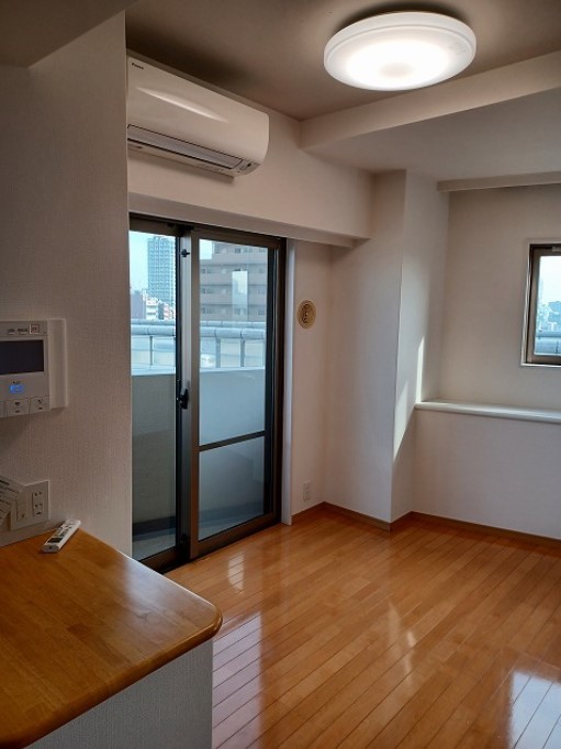 二面バルコニーが広がる角部屋はグリル付きの3口システムキッチンや追い炊き、浴室乾燥機、独立洗面化粧台、温水洗浄便座、エアコン等の設備に優れた2DK。宅配ボックスやゴミ置場、駐輪場等の共用設備も充実。