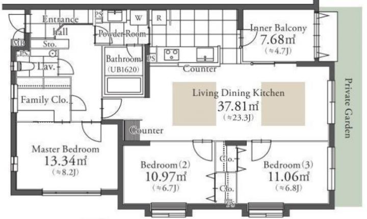 専用庭やインナーバルコニーがある複数面採光の角部屋はディスポーザーやグリル付きの3口カウンターキッチンや追い炊き、浴室乾燥機、三面鏡付独立洗面台等の設備に優れ、ウォークインクローゼットがあり収納豊富