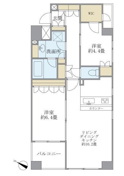 | 間取り詳細 | LDK:10.2畳 洋室:6.4畳、4.4畳 |