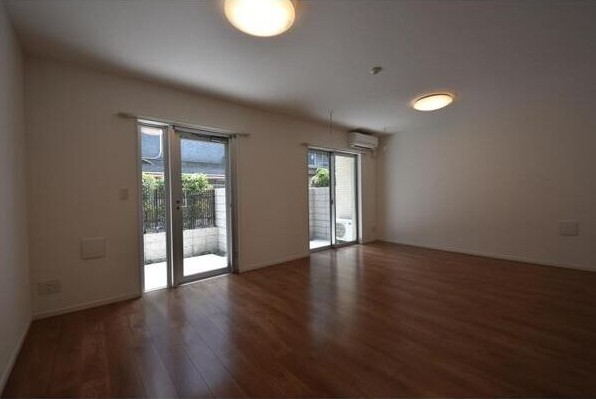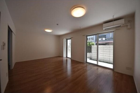 南向き、専用庭の広がる1LDKはインターネット利用料が無料。2口ガスのシステムキッチンや追い炊き、浴室乾燥機、独立洗面台、温水洗浄便座、エアコン等の室内設備や宅配ボックス、駐輪場等の共用設備も充実。