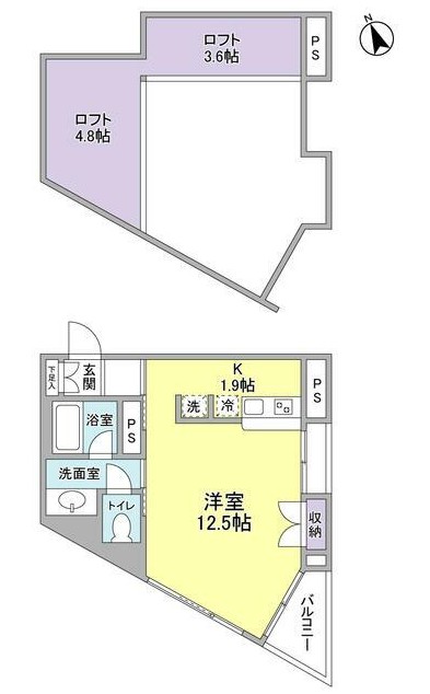 | 間取り詳細 | 洋室:12.5畳 K:1.9畳 ロフト:4.8畳、3.6畳 |