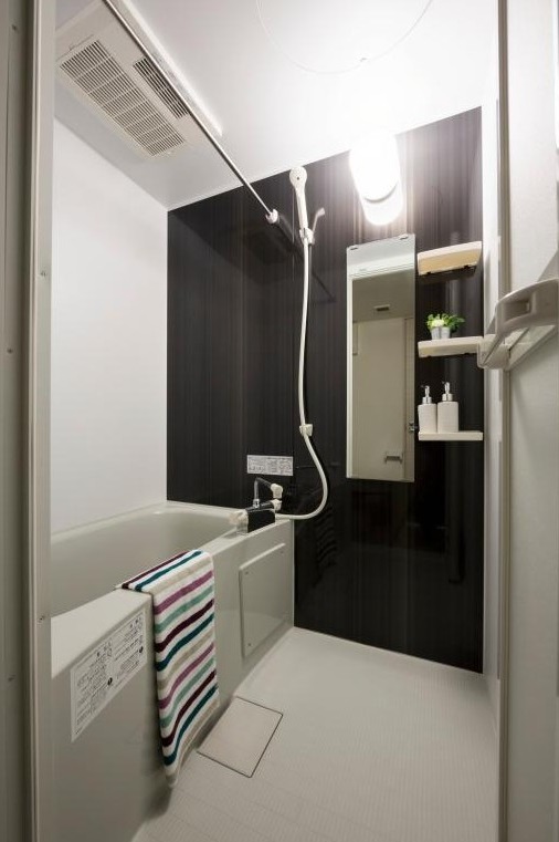 南向き、二面採光の1LDKは一部コンクリート打ち放しの壁をスポットライト照明が照らすお洒落な室内。独立洗面台や浴室乾燥機、2口システムキッチン等の室内設備や宅配ボックス、防犯カメラ等の共用設備も充実。