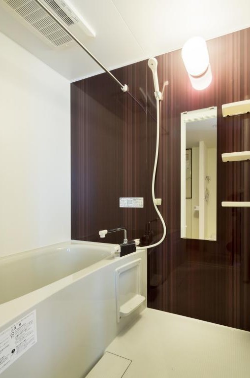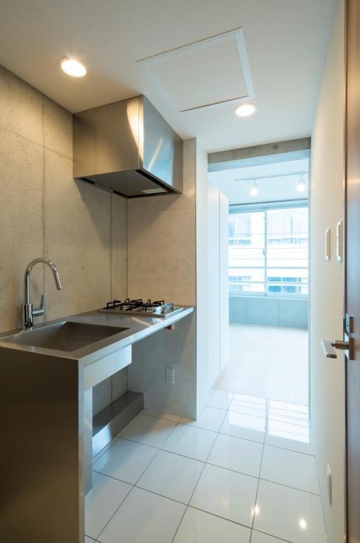 角部屋、二面採光の1Kはコンクリート打ちっぱなしの壁をスポットライト照明が照らすお洒落な造り。独立洗面台やステンレス製のお洒落な2口ガスキッチン、浴室乾燥機等の室内設備や宅配ボックス等の共用設備も充実