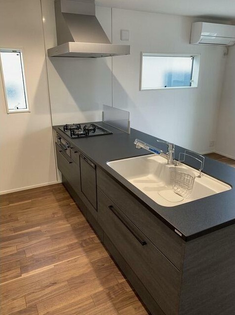駐車場付き、サービスルームが3部屋ある1SLDKの新築戸建て。全5室にエアコンがあり、リビングの床暖房や食洗器、浄水器付きの3口カウンターキッチン、追い炊き、三面鏡付洗髪洗面化粧台等の設備が充実。