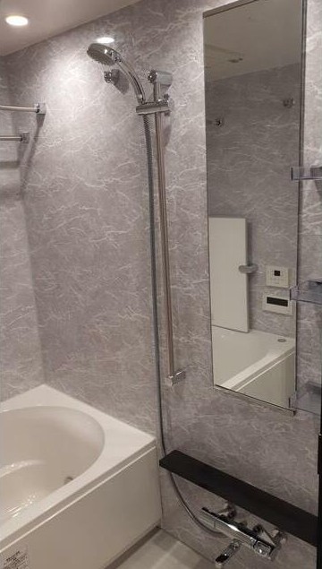 最上階、南向きの1LDKはウォークインクローゼットがあり収納豊富。ミストサウナや追い炊き、浴室乾燥機付きのお風呂やグリル付きのカウンターキッチン、床暖房、三面鏡付洗髪洗面化粧台等の設備に優れた新築マンション