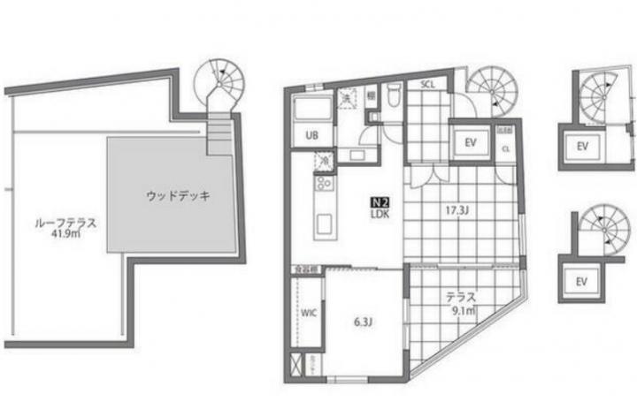 ホームエレベーターや螺旋階段が室内にあるデザイナーズマンション。一部ウッドデッキの41.9㎡のルーフテラスがある開放的な室内は3口ガスのカウンターキッチンや追い炊き、独立洗面化粧台等の設備が充実