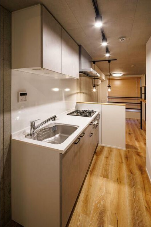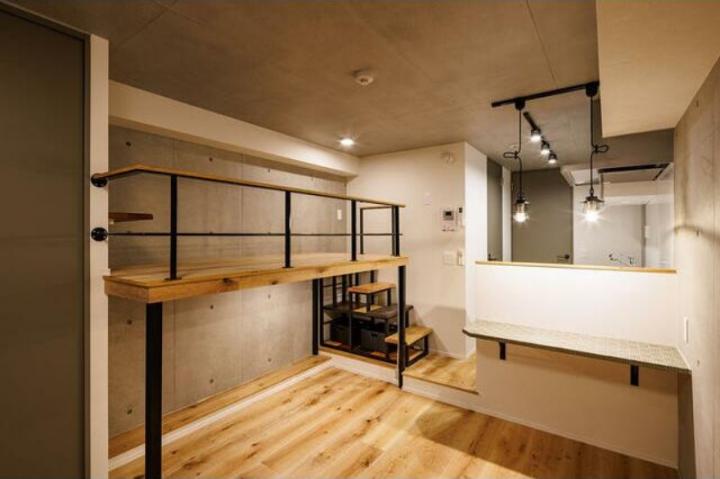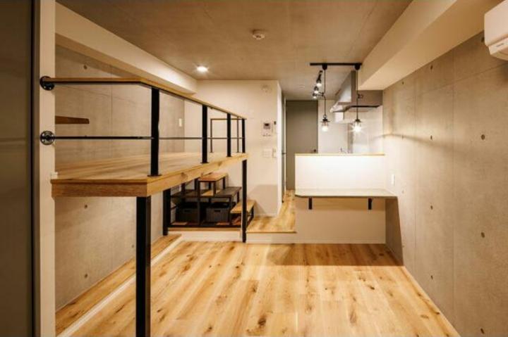 | コンクリート打ちっぱなしの壁にスポットライト照明、木目調の床、下部収納のベッドスペース等がお洒落なデザイナーズ賃貸。3口システムキッチンや追い炊き、浴室乾燥機、独立洗面台、温水洗浄便座等の設備が充実 |