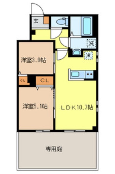 | 間取り詳細 | LDK:10.7畳 洋室:5.1畳、3.9畳 |