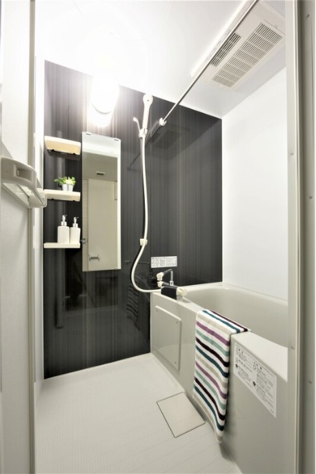 南向きの室内は一部コンクリート打ち放しの壁をスポットライト照明が照らすお洒落な室内。独立洗面台や浴室乾燥機、2口システムキッチン、温水洗浄便座等の室内設備や宅配ボックス、防犯カメラ等の共用設備も充実。